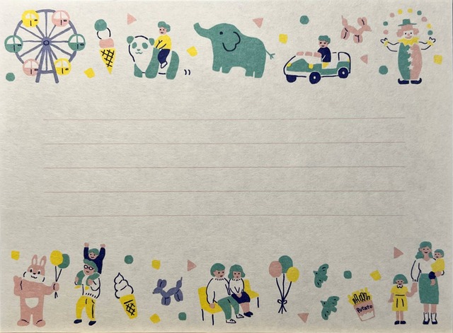 懐かしさ漂う百貨店の屋上遊園地をモチーフにした、古川紙工のレターセット「レトロデパート」シリーズの便箋です。 観覧車やバッテリーカー、アイスクリームや動物たちなど、子ども時代の思い出が詰まったやさしいイラストが紙面を彩ります。 封筒は付属せず、便箋1枚のみの販売となります。 ●商品内容:便箋1枚(封筒なし) ●サイズ:約 縦138mm × 横185mm ●製造元:古川紙工株式会社 ●日本製 ※ メーカー販売終了品。入手困難なプレミアアイテムです。 ───── This letter sheet is from the “Retro Department Store” series by Furukawa Paper Works, featuring charming illustrations of a nostalgic rooftop amusement park. Ferris wheels, battery cars, and cheerful families recall joyful memories of childhood. This listing includes only the letter sheet—no envelope is included. ● Size: approx. H138mm × W185mm ● Contents: 1 letter sheet (no envelope) ● Manufacturer: Furukawa Paper Works Co., Ltd. ● Made in Japan ※ This product is already sold out at the manufacturer, making it a rare collectible.