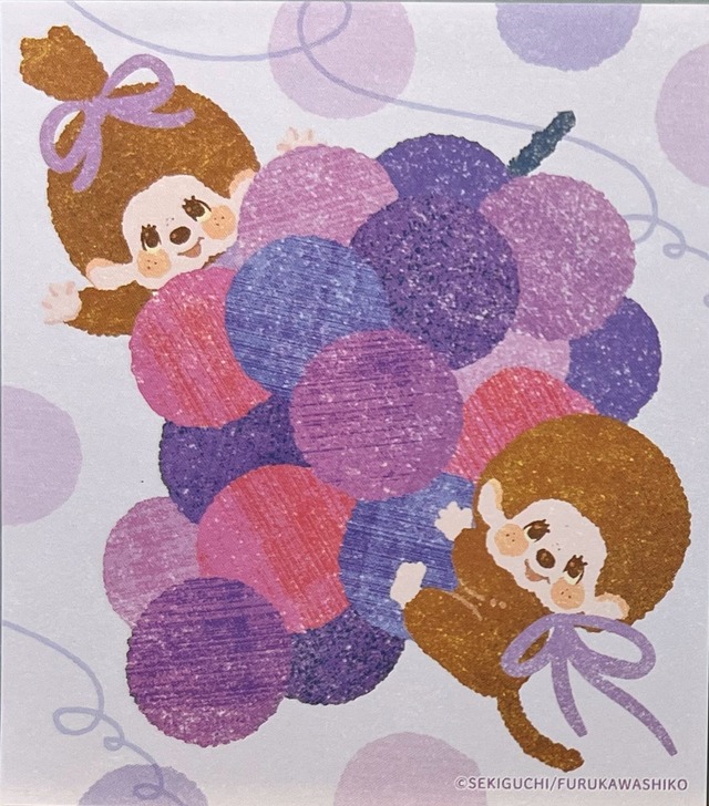 大人気キャラクター「モンチッチ」と古川紙工がコラボした、レトロでかわいいメモパッド〈ぶどう柄〉です。 カラフルなぶどうの実に、ちょこんとのぞく2匹のモンチッチ。 紫やピンク、赤系の粒がぎゅっと集まった配色が優しく、どこか懐かしさのあるデザインです。 サイズは約縦9cm × 横8cmで、メッセージや手帳にも使いやすい手のひらサイズ。 モンチッチファンはもちろん、紙もの・キャラクター文具好きな方にもおすすめの1枚です。 ・商品内容:4柄各1枚(計4枚)での販売。 ・サイズ:約縦9cm × 横8cm ・著作:©SEKIGUCHI ・製造・販売元:古川紙工株式会社 A retro-cute memo pad featuring Monchhichi peeking out from a colorful bunch of grapes. Created in collaboration with Furukawa Paper Works, the design blends shades of purple, pink, and red for a soft and nostalgic look. Two Monchhichi characters playfully hide among the fruit, bringing a warm and playful charm to the page. The memo pad measures approx. 9cm × 8cm, making it perfect for notes, planners, or gift enclosures. A must-have for Monchhichi fans and lovers of cute stationery. - Product Details: Sold as a set of four pieces (one of each design). - Size: Approx. 9cm × 8cm - Copyright: ©SEKIGUCHI - Manufactured and Sold by: Furukawa Paper Works Co., Ltd.