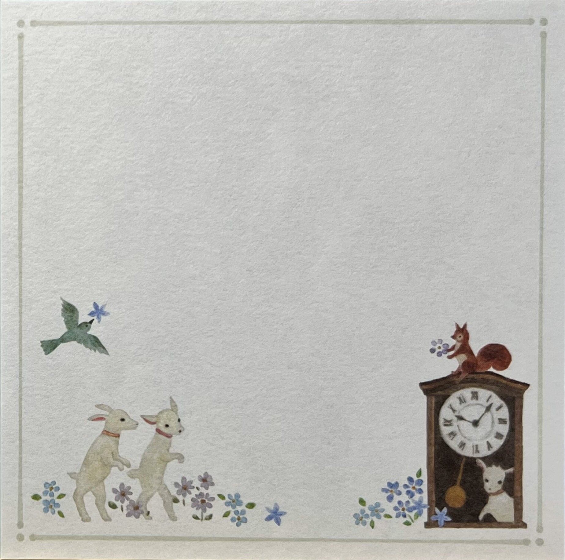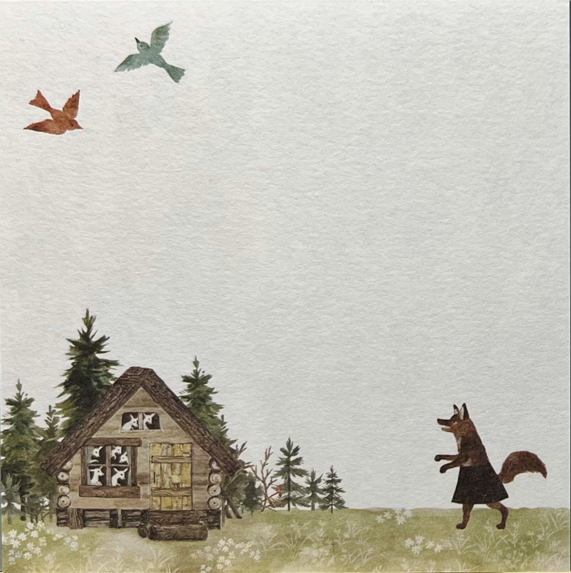 A charming square memo pad featuring a scene from the Grimm fairy tale “The Wolf and the Seven Little Goats.”
