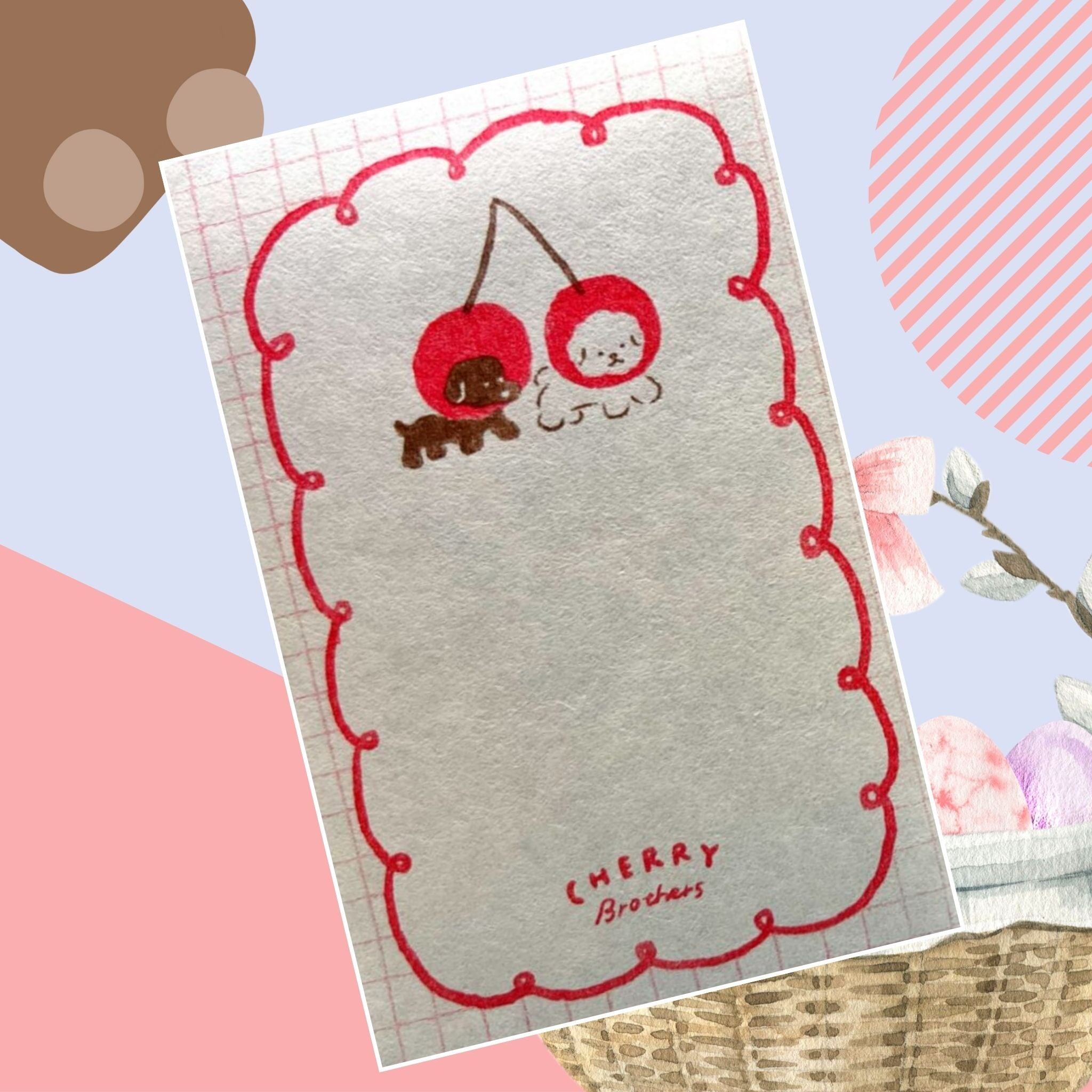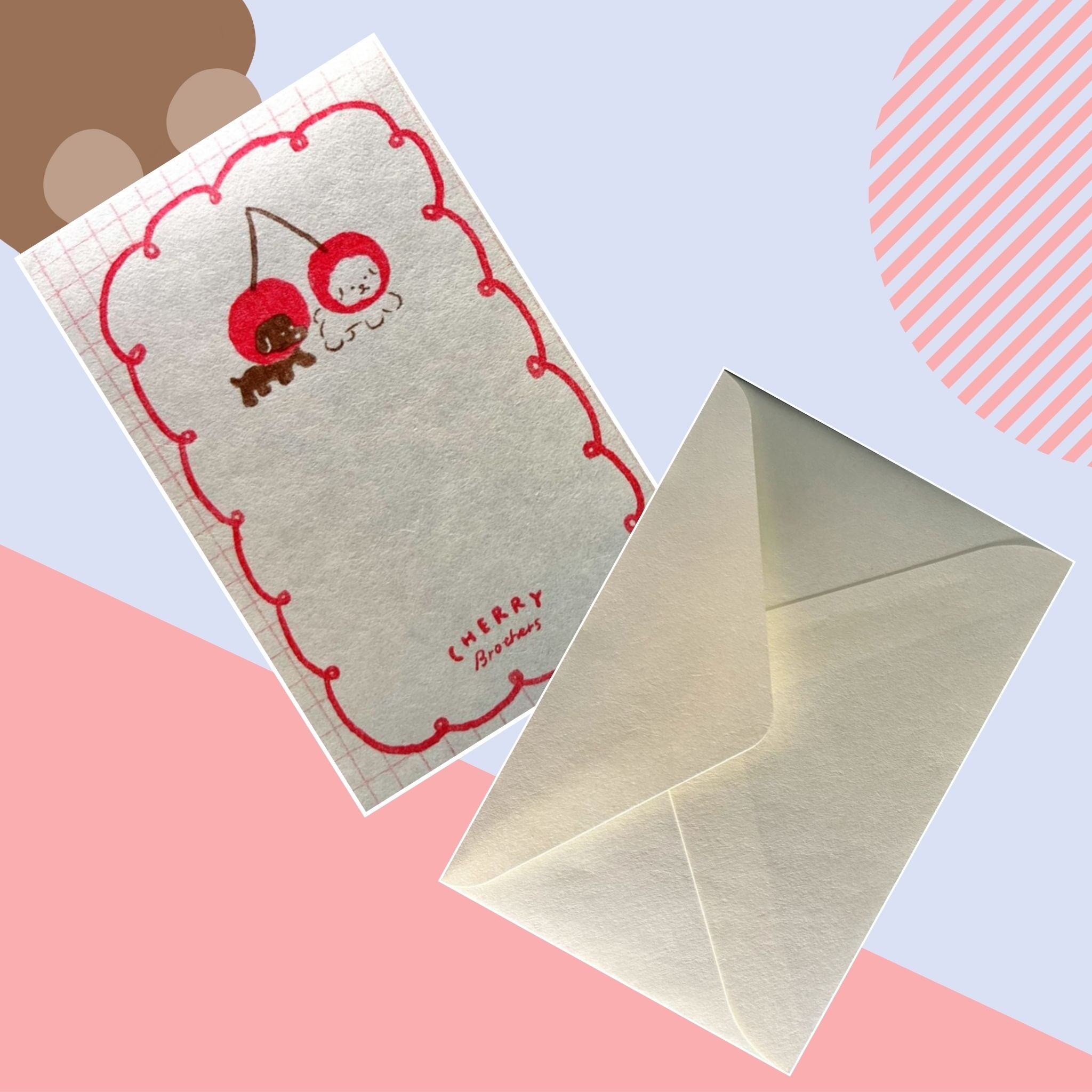 チェリーに変身した2匹のわんこ「チェリーブラザーズ」が描かれた、ユニークで愛らしいミニレターセットです。
