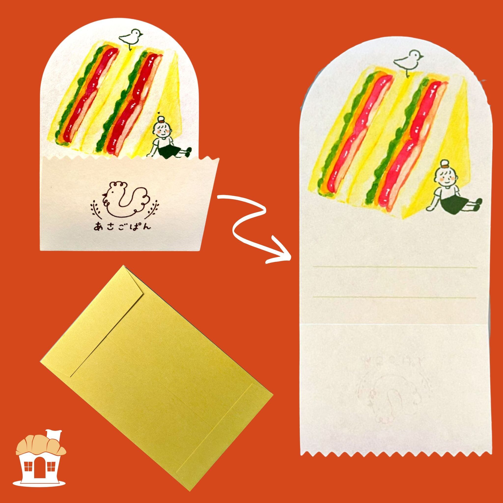 袋のような封筒と、開くと具材たっぷりのサンドイッチが現れる便箋の組み合わせがユニーク。