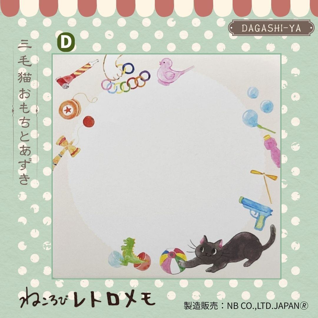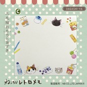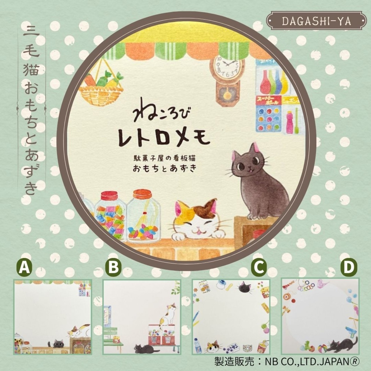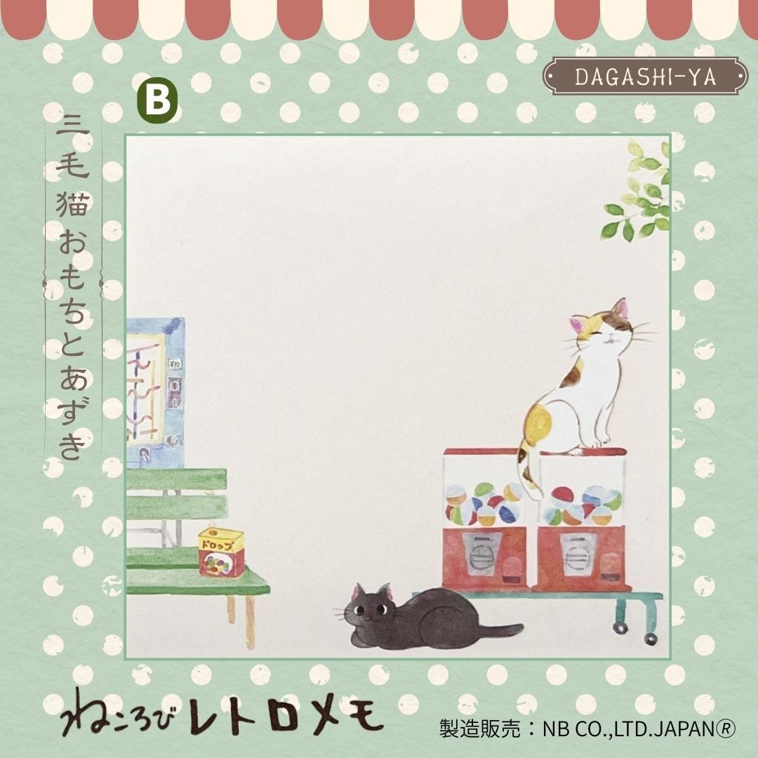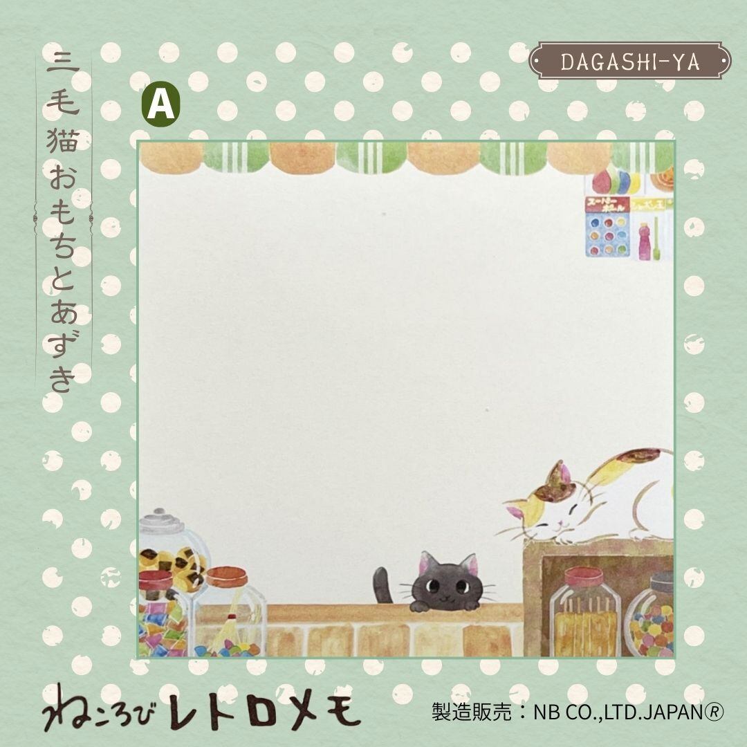 The “Nekorobi Memo Omoto & Azuki” is a retro-style memo pad featuring the shop cats Omoto (calico) and Azuki (black), set in an old-fashioned Japanese candy store.