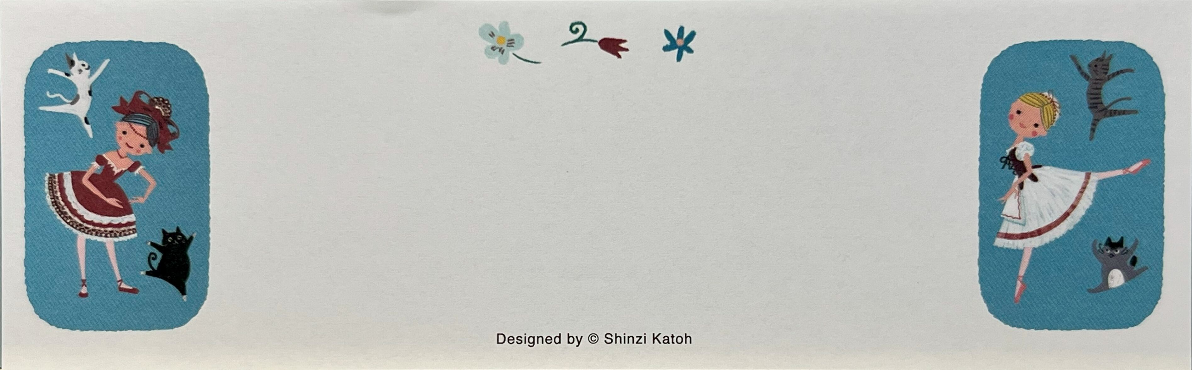 左右にはバレエを踊る少女と黒猫のイラスト、中央には書きやすい余白が設けられていて、手紙や一言メッセージにぴったりのレイアウト。