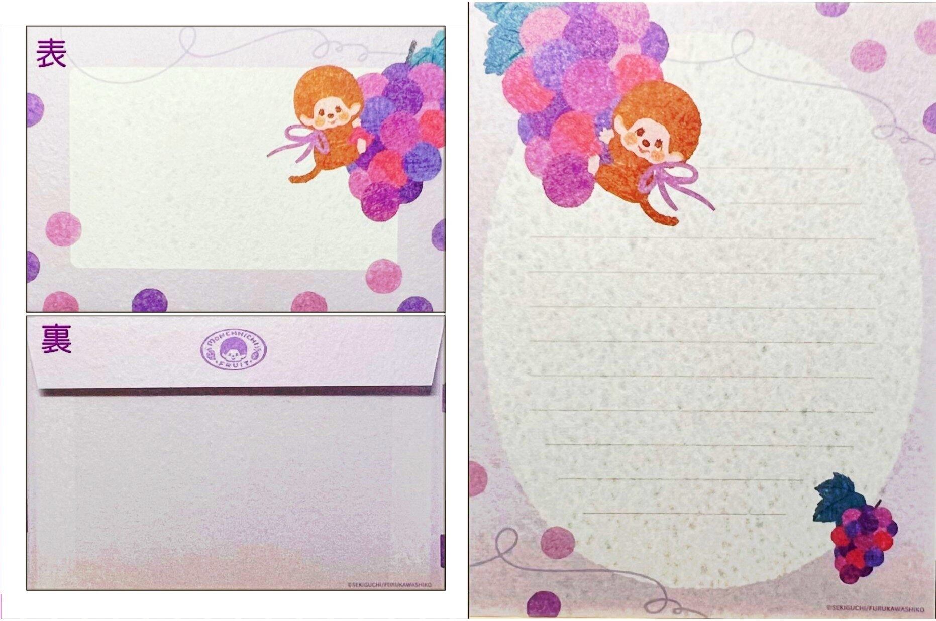 たわわに実ったぶどうのイラストと、レトロな可愛さの「モンチッチ」がコラボした美濃和紙のレターセットです。